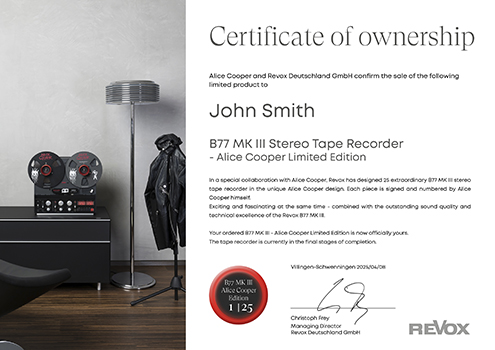 Ve speciální spolupráci s Alicem Cooperem vyrobil Revox 25 mimořádných přístrojů B77 MK III v jedinečném designu Alice Cooper. Každý kus je podepsán a očíslován samotným Alicem. Výjimečný design v kombinaci s vynikající a oslavovanou zvukovou a technickou jedinečností Revox B77 MK III.