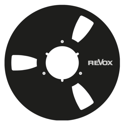 NAB prázdná standardni kovová cívka REVOX na 1/4″ pás 26,5 cm barva čená spolu s klimatickým archivačním boxem v bílé barvě